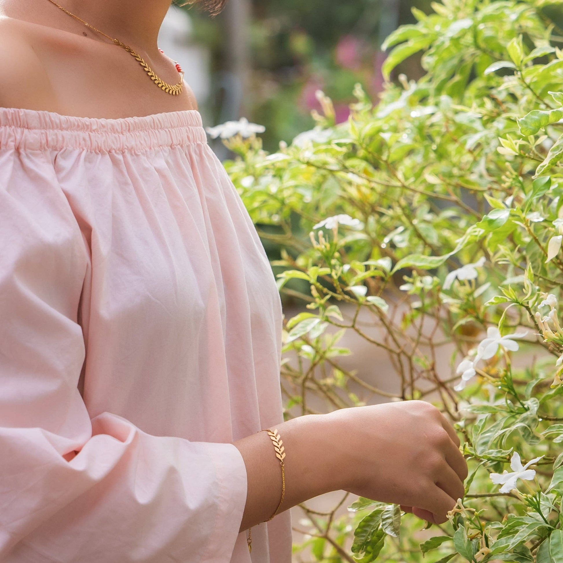 Eden's Desert Wildflower Bracelet evokes the petals of a desert flower through its five chevron pendants. Crafted from 18K gold-plated stainless steel this elegant bracelet adds a touch of warmth and grace to any look. Designed for comfort and versatility, it measures 6.5" with a 0.5" extension chain for an adjustable fit.
