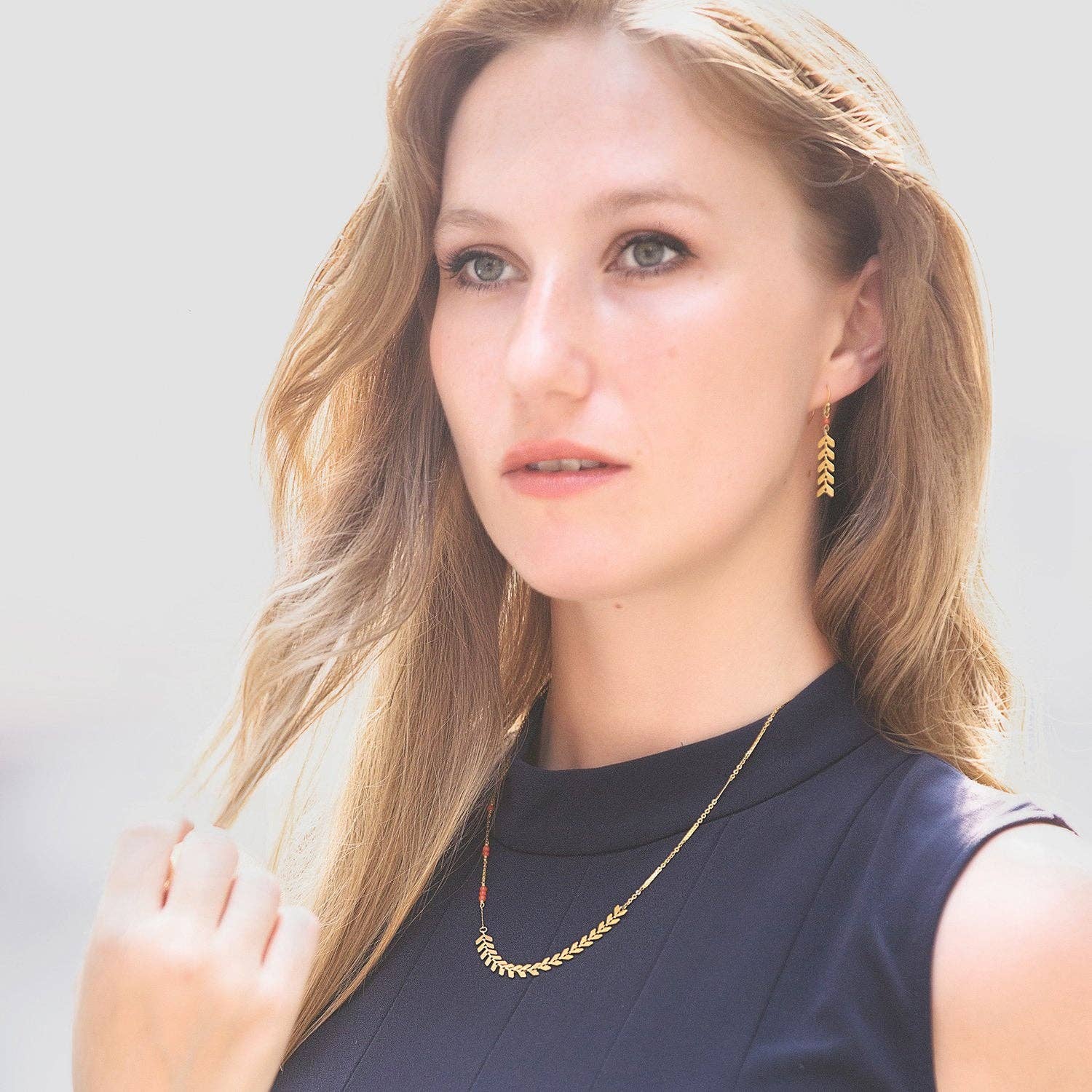 Eden's Desert Wildflower Necklace evokes the petals of a desert flower through its five chevron pendants. The material is 18K gold-plated stainless steel and sits on an 18" chain with a 2" extension.