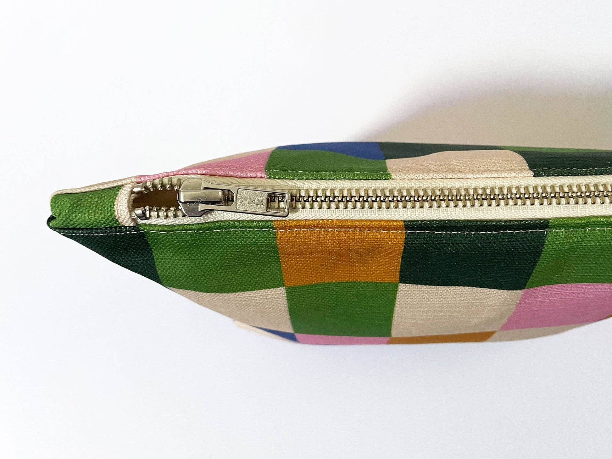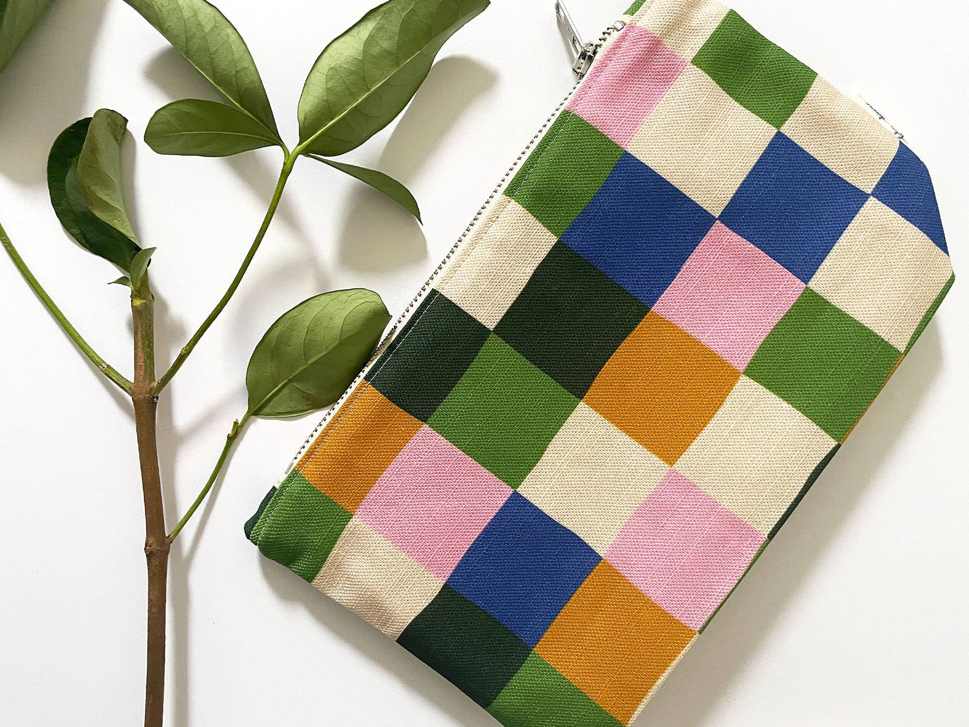 This fun and eye-catching handmade zip pouch features a bold checkered print in bold tones — designed and sewn in Melbourne by Beck Ng of Fabric Drawer. Crafted from a soft linen/cotton blend with a natural cotton lining, it's perfect for organising your daily essentials. Use it as a make-up bag, travel pouch, pencil case or clutch — whatever your day needs! Each pouch is made in small batches, so no two are exactly alike, making it a colourful and practical gift or a cheerful treat for yourself.