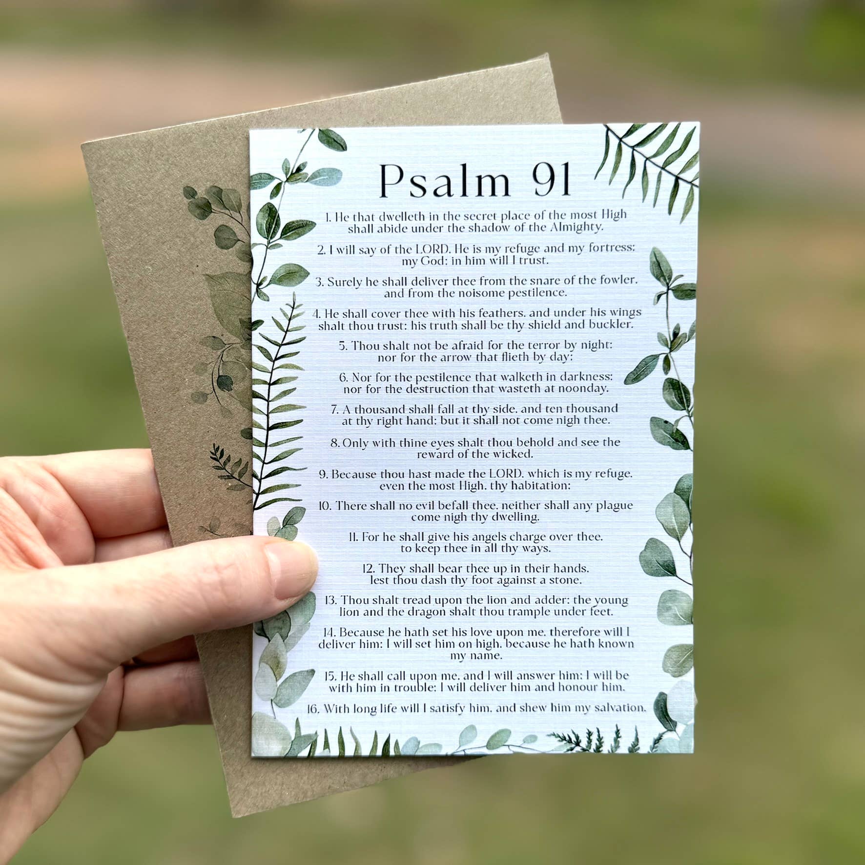 A simple and earthy encouragement card featuring the full chapter of Psalm 91 on the front. Neutral tones and minimalist design make it a meaningful piece to give or keep close during uncertain times.